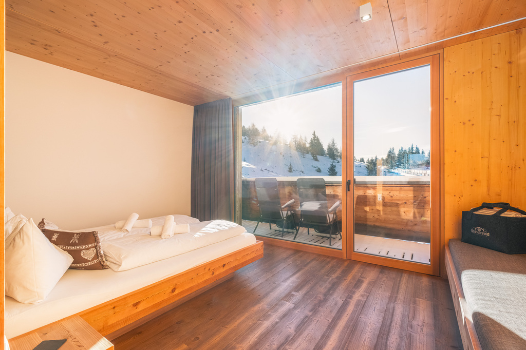 Viel Raum für Träume. Der Duft von massivem Zirbenholz senkt den Herzschlag und sorgt für tiefen Schlaf. Genießen Sie den Luxus eines getrennten Wohnbereichs, einer großen Loggia und eines Panoramabads mit Badewanne.
