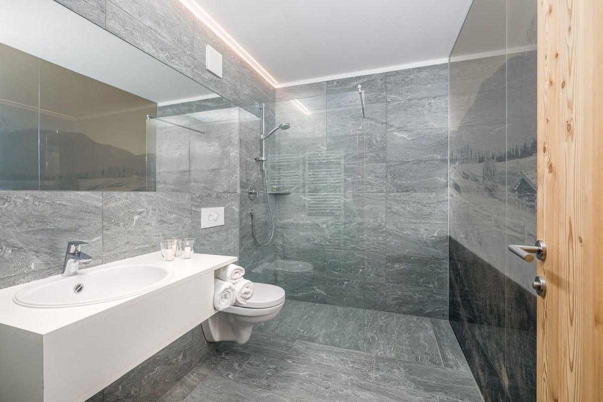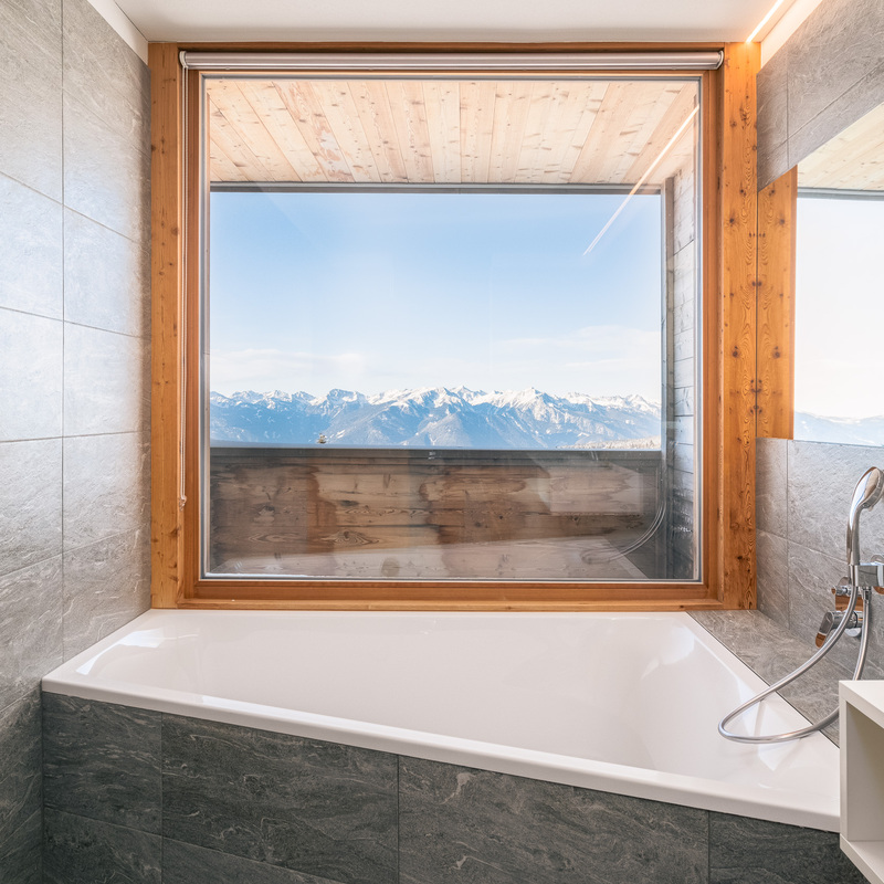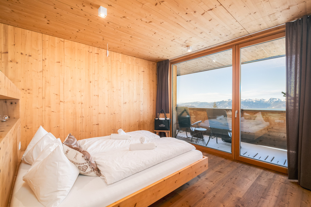 Viel Raum für Träume. Der Duft von massivem Zirbenholz senkt den Herzschlag und sorgt für tiefen Schlaf. Genießen Sie den Luxus eines getrennten Wohnbereichs, einer großen Loggia und eines Panoramabads mit Badewanne.